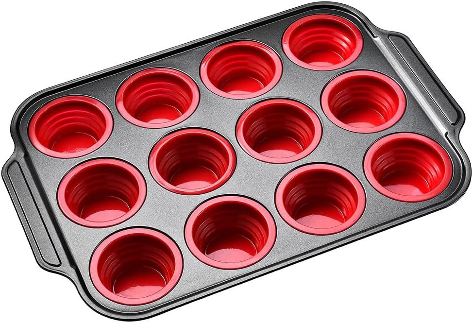 12-Cup Silicone Muffin Pan, Non-Stick Baking Mould, 40×27.5×2 cm, Black and Red