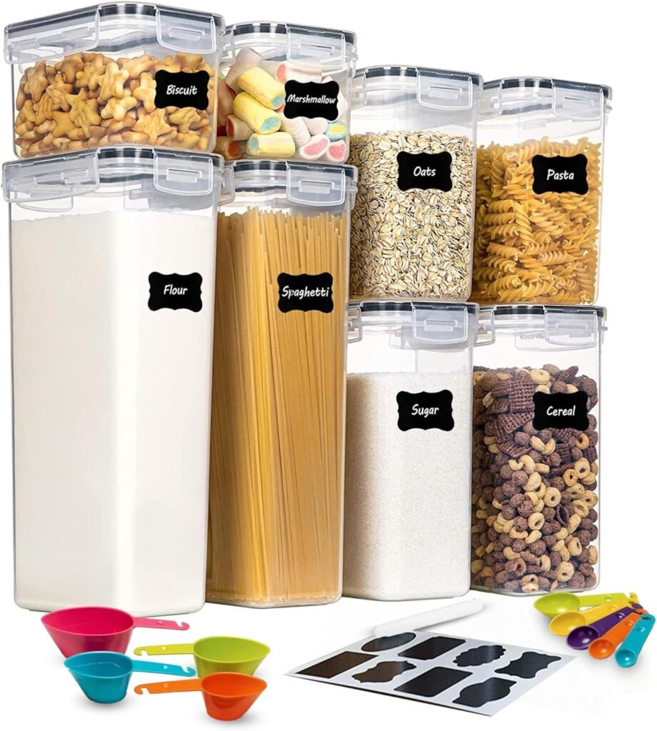 8-Pc Airtight Food Storage Containers Set – BPA-Free Plastic Pantry Canisters for Rice, Cereal, Flour, Sugar, Pasta – Stackable Kitchen Organisers with Labels, Marker, Measuring Cups & Spoons