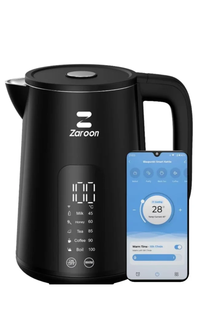 Zaroon Smart Digital Kettle is a powerful 2000W high-speed boiler that combines precision with modern connectivity. Featuring a generous 1.7L capacity and a safe double-wall design, this kettle offers five custom temperature settings easily managed via a sleek LED touch display or the Tuya App for seamless remote control. Its concealed heating plate ensures easy cleaning, making it the ultimate blend of safety, style, and smart technology for any kitchen.